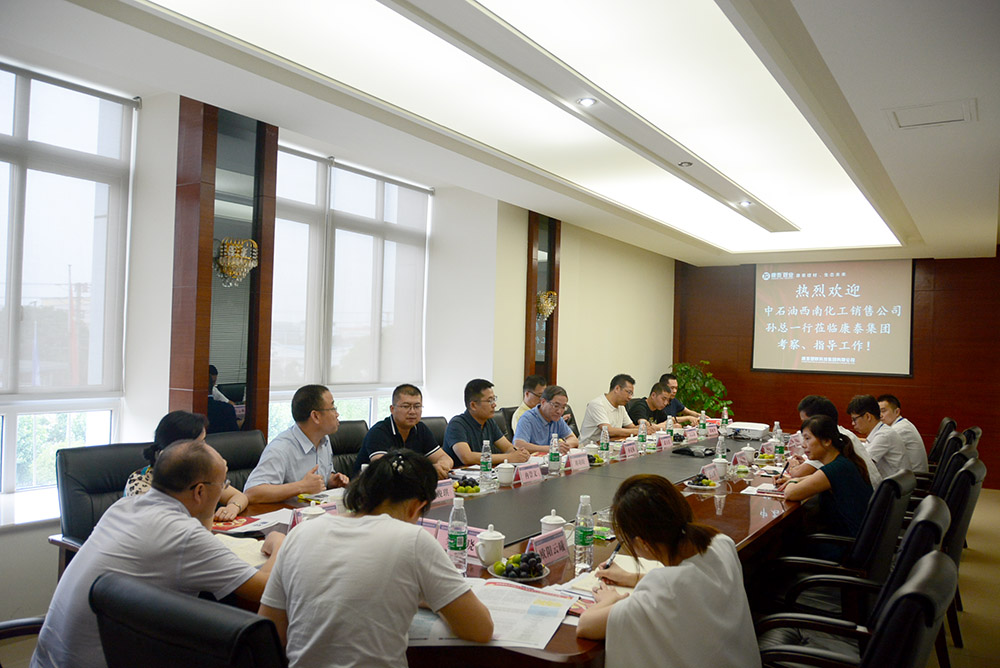 6月25日下午,中石油西南化工銷售公司總經(jīng)理孫克棟率領(lǐng)四川石化、獨山子石化相關(guān)負(fù)責(zé)人一行蒞臨康泰參觀考察??堤┘瘓F(tuán)董事長兼總裁林云青,副總裁張文霖,采供中心總監(jiān)潘云琴熱情歡迎領(lǐng)導(dǎo)的到來并座談。