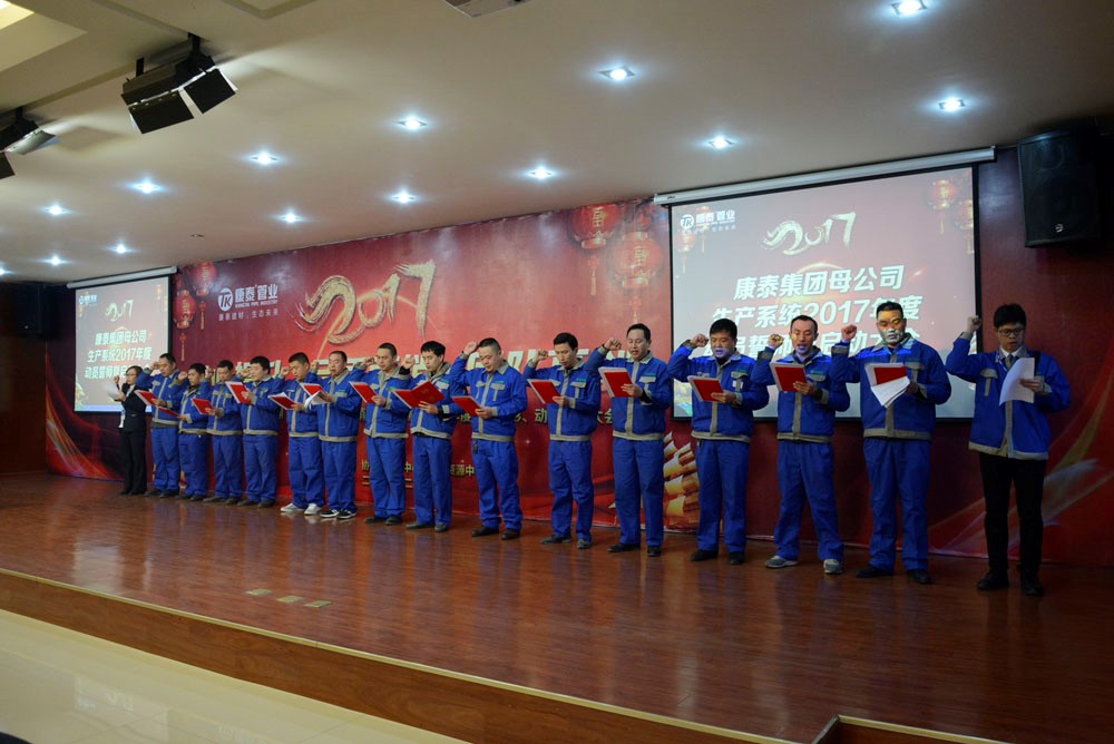 ? ? ? ?為清晰傳遞公司發(fā)展戰(zhàn)略,有效提升產(chǎn)品配套齊全、性價比優(yōu)、質(zhì)量穩(wěn)定受控的生產(chǎn)后勤保障優(yōu)勢,2月22日下午,由生產(chǎn)中心主辦,人力資源中心、市場中心協(xié)辦的“康泰集團(tuán)2017年度生產(chǎn)系統(tǒng)保障動員誓師大會”在集團(tuán)總部召開??堤┘瘓F(tuán)董事長兼總裁林云青,以及集團(tuán)副總裁、各中心總監(jiān)和中層以上干部、車間班組長、車間員工代表等100多人參加會議。