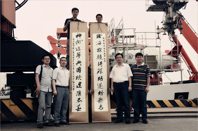 ??? 2014年6 月24日,正是江南多雨時(shí)節(jié)。素有魚米之鄉(xiāng)美譽(yù)的無(wú)錫城在一番新雨洗滌之后更顯得清新秀麗,味韻雋永。這一日,應(yīng)國(guó)家深海基地管理中心邀請(qǐng),康泰集團(tuán)總裁特別助理兼品牌總監(jiān)鄭光鏵受林總裁委托,聯(lián)袂中國(guó)著名書法大師林嶠老師以及“蛟龍?zhí)枌?duì)聯(lián)征集活動(dòng)”一等獎(jiǎng)得主渠芳慧先生抵達(dá)江陰港,一起為蛟龍?zhí)柍龊将I(xiàn)禮祝賀,并零距離參觀了蛟龍?zhí)柹顫撈?。?guó)家深?;毓芾碇行母敝魅渭孓k公室主任李直東及國(guó)家深?;毓芾碇行恼猩剔k主任馬廣寧、副主任范道偉等領(lǐng)導(dǎo)熱情的接待了鄭總一行。