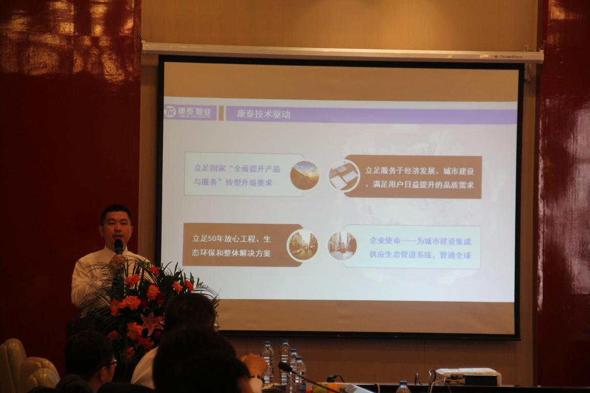 接著,康泰集團(tuán)技術(shù)總監(jiān)張雙全向在場(chǎng)嘉賓介紹了康泰集團(tuán)的新產(chǎn)品體系,重點(diǎn)介紹了康泰MPP單壁波紋管道系統(tǒng)、環(huán)保雨、污水用MPVE?雙壁波紋管道系統(tǒng)等產(chǎn)品。參會(huì)嘉賓認(rèn)真聽(tīng)取了公司的產(chǎn)品介紹,對(duì)康泰新產(chǎn)品的物理性能、產(chǎn)品質(zhì)量和化學(xué)配方等方面給予了高度評(píng)價(jià)。
