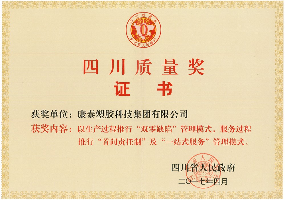 三是質(zhì)量強企,獲得第四屆四川質(zhì)量獎??堤┘瘓F以“圍繞全球顧客、不斷改善,追求產(chǎn)品零缺陷”的質(zhì)量方針,貫徹“產(chǎn)品如人品”的質(zhì)量理念,全面覆蓋ISO9001、ISO14001、OHSAS18001三體系,實施全員、全面質(zhì)量管理,通過導(dǎo)入PDCA循環(huán)管理和QCC體系,嚴格質(zhì)檢把控,確保從原料進廠到產(chǎn)品出廠的優(yōu)質(zhì)質(zhì)量保障??堤┫群髽s獲全國質(zhì)量誠信標桿典型企業(yè)、全國質(zhì)量檢驗穩(wěn)定合格產(chǎn)品、全國百佳質(zhì)量誠信標桿示范企業(yè)等榮譽稱號。2017年,憑借“生產(chǎn)過程推行‘雙零缺陷’管理模式,即供應(yīng)鏈來料100%合格進廠、產(chǎn)品質(zhì)量100%合格出廠,始終貫徹執(zhí)行態(tài)度零容忍、質(zhì)量零缺陷的‘雙零缺陷’管理模式”。康泰集團從全省眾多優(yōu)秀企業(yè)中脫穎而出,成為唯一獲得第四屆“四川質(zhì)量獎”的塑膠建材企業(yè)。